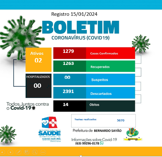 | 2 | BOLETIM DIÁRIO COVID-19 DE 15-01-2024 | 2024 | 1 | BOLETIM DIÁRIO COVID-19 | FUNDO MUNICIPAL DE SAÚDE DE BERN. SAYÃO | cloud_download Visualizar (158 downloads) |