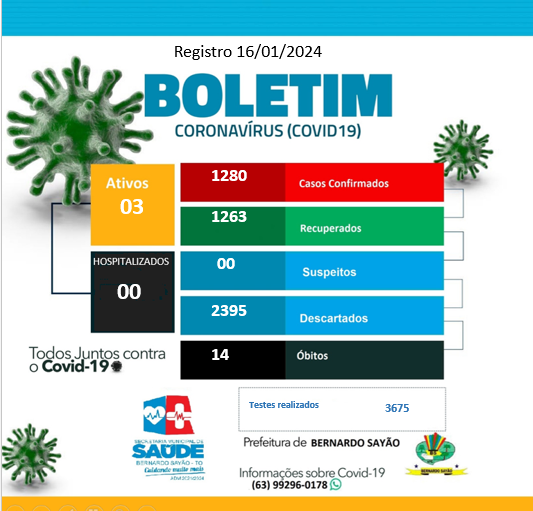 | 3 | BOLETIM DIÁRIO COVID-19 DE 16-01-2024 | 2024 | 1 | BOLETIM DIÁRIO COVID-19 | FUNDO MUNICIPAL DE SAÚDE DE BERN. SAYÃO | cloud_download Visualizar (161 downloads) |