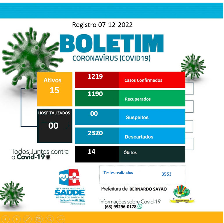 | 4 | BOLETIM DIÁRIO DE COVID-19 DE 14-12-2022 | 2022 | 12 | BOLETIM DIÁRIO DE COVID-19 DE | FUNDO MUNICIPAL DE SAÚDE DE BERN. SAYÃO | cloud_download Visualizar (150 downloads) |
