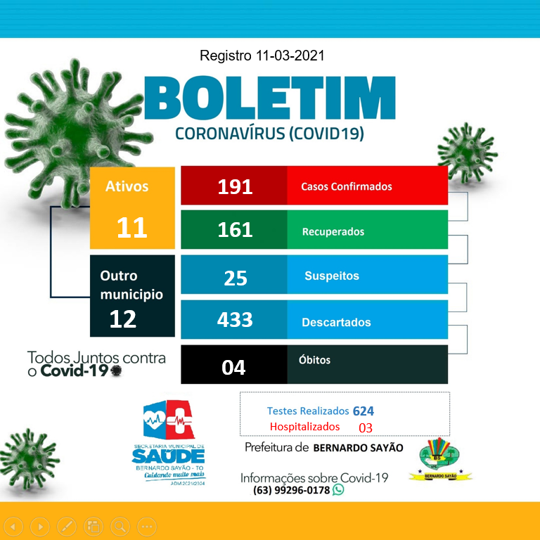 | 8 | BOLETIM DIÁRIO COVID-19 DE 10-03-2021 | 2021 | 3 | BOLETIM DIÁRIO COVID-19 | PREFEITURA MUNICIPAL DE BERNARDO SAYÃO | cloud_download Visualizar (122 downloads) |