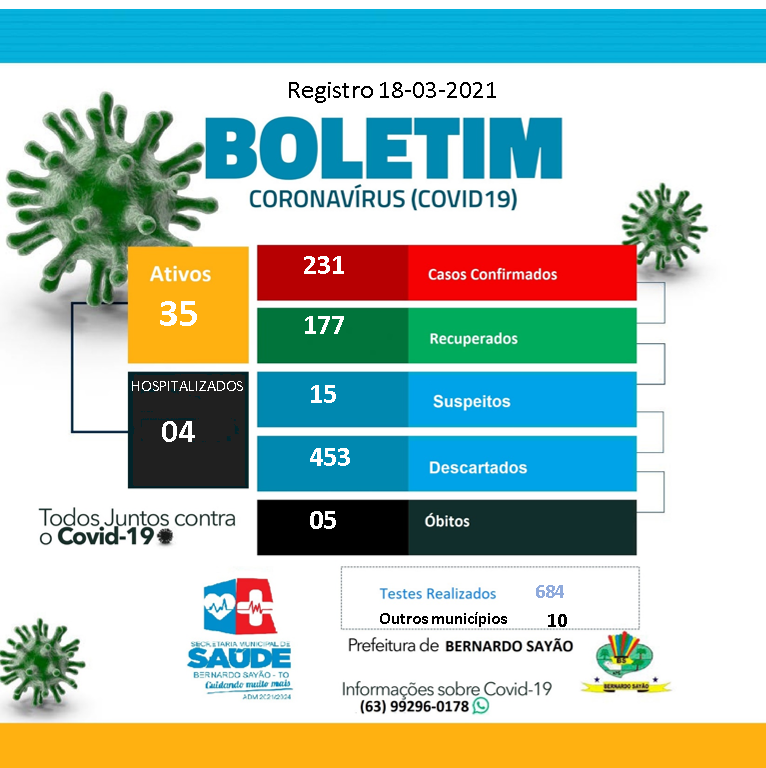 | 9 | BOLETIM DIÁRIO COVID-19 DE 09-03-2021 | 2021 | 3 | BOLETIM DIÁRIO COVID-19 | PREFEITURA MUNICIPAL DE BERNARDO SAYÃO | cloud_download Visualizar (147 downloads) |