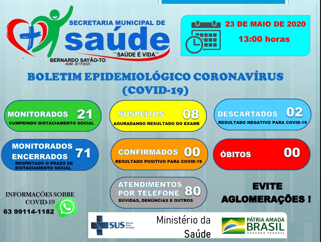 | 10 | BOLETIM DIARIO COVID-19 DE 23-05-2020 | 2020 | 5 | BOLETIM DIÁRIO COVID-19 | FUNDO MUNICIPAL DE SAÚDE DE BERN. SAYÃO | cloud_download Visualizar (160 downloads) |