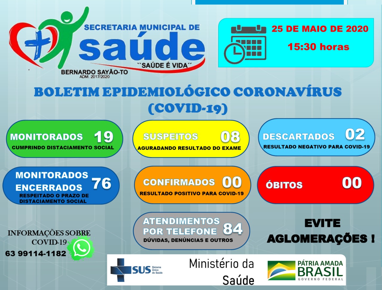 | 8 | BOLETIM DIARIO COVID-19 DE 25-05-2020 | 2020 | 5 | BOLETIM DIÁRIO COVID-19 | FUNDO MUNICIPAL DE SAÚDE DE BERN. SAYÃO | cloud_download Visualizar (167 downloads) |