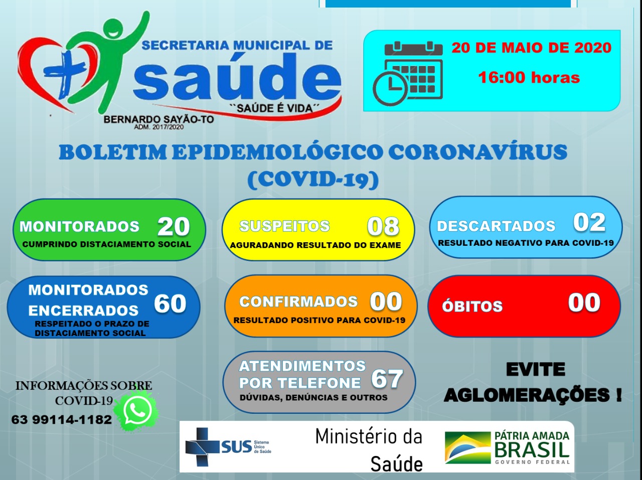 | 3 | BOLETIM DIARIO COVID-19 DE 20-05-2020 | 2020 | 5 | FUNDO MUNICIPAL DE SAÚDE DE BERN. SAYÃO | cloud_download Visualizar (128 downloads) | |
